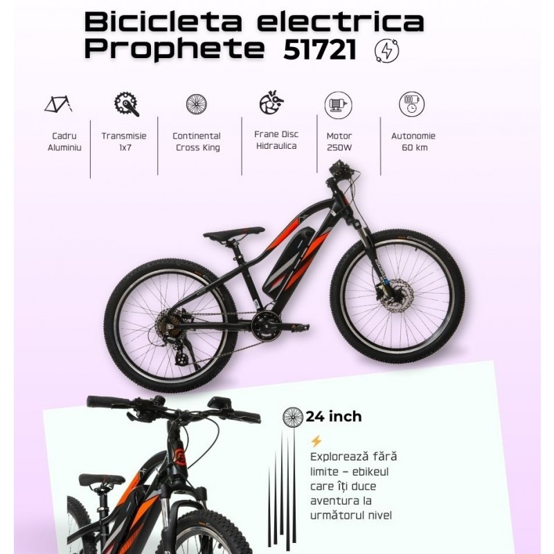 Bicicleta electrica Devron 51721 24" echipata cu o transmisie 1 x 7 viteze si un motor Blaupunkt de 250W.