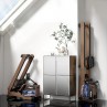Designul vertical permite depozitarea ușoară, economisind spațiu.