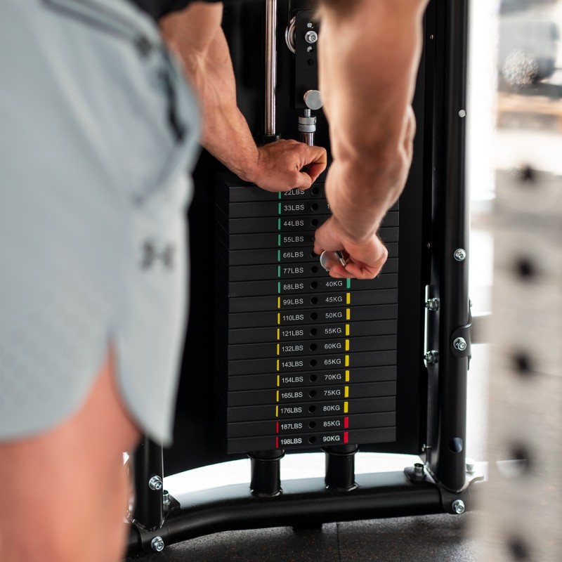 Cele două pachete independente de greutati 2×90 kg rulează pe scripete din aluminiu cu rulmenți. Punctele articulare ale scripetelui transversal permit ajustarea completă a direcției de tracțiune, iar scala precisă de poziționare îți permite să aliniezi mânerele exact la dimensiunile corpului.