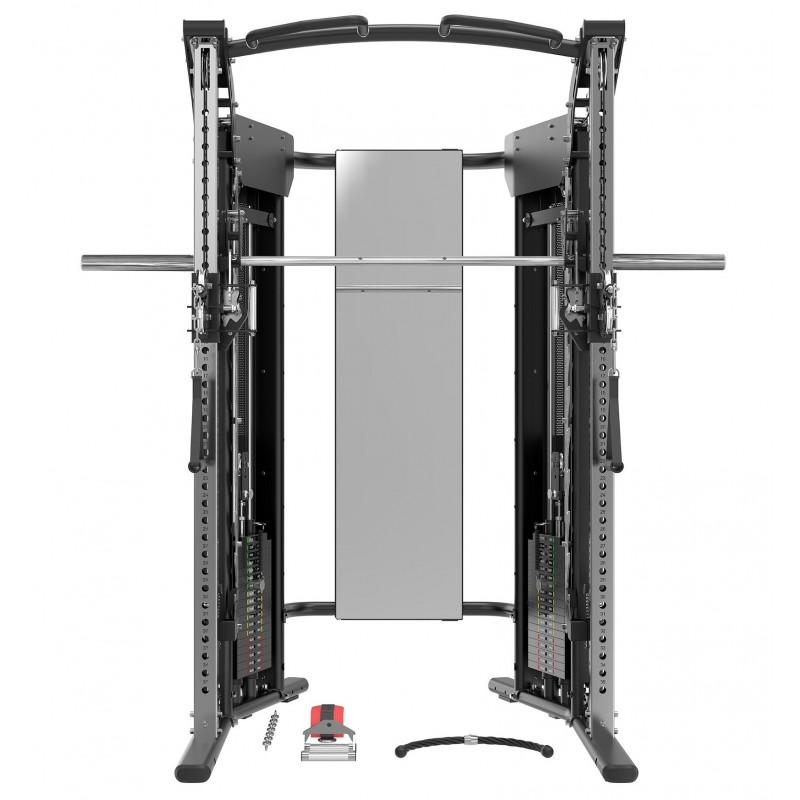 CYKLOP 10 este o stație de antrenament avansată — un sistem complet 3-în-1 care combină un Smith machine, un power rack și un cable crossover. Cu două stive de greutăți de 90 kg și un mecanism inteligent care conectează bara Smith la stiva de greutăți, poți să te antrenezi cu greutăți libere, cu stack-ul sau… cu ambele simultan. Un singur aparat care înlocuiește jumătate de sală.