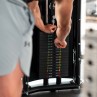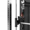 Sistemul unic de cabluri conectează bara Smith direct la stivele de greutăți — ajustezi încărcătura cu o singură mișcare, fără să mai adaugi discuri. Atașează cârligul special la bară pentru a trece pe modul stack; poți utiliza și discuri, sau poți combina ambele tipuri de rezistență. Un sistem de siguranță protejează împotriva scăpării accidentale a barei, iar coloanele din oțel cu rack permit fixarea barei la orice înălțime.