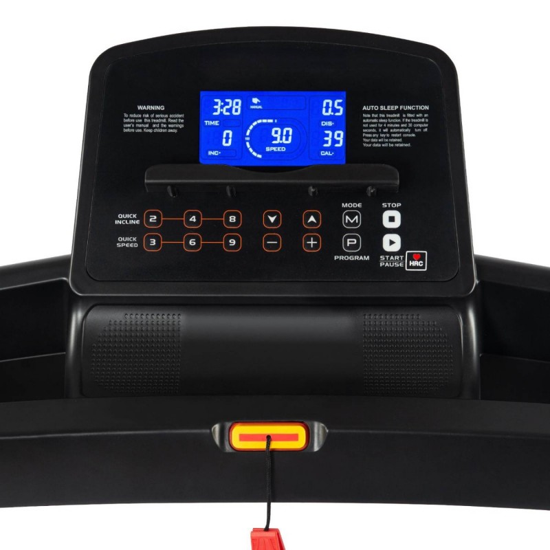 Motorul fiabil de 1.75 CP asigura o functionare uniforma, iar suprafata de alergare de 125 x 42 cm ofera suficient spatiu pentru miscari naturale. Datorita profilului plat al carcasei motorului, zona utila este maximizata, ceea ce face antrenamentul mai confortabil si mai sigur. Designul intuitiv include butoane rapide pentru viteze presetate (3 / 6 / 9 km/h) si pentru nivelurile de inclinare (2 / 4 / 8%), ceea ce permite ajustari rapide in timpul sesiunii de alergare.