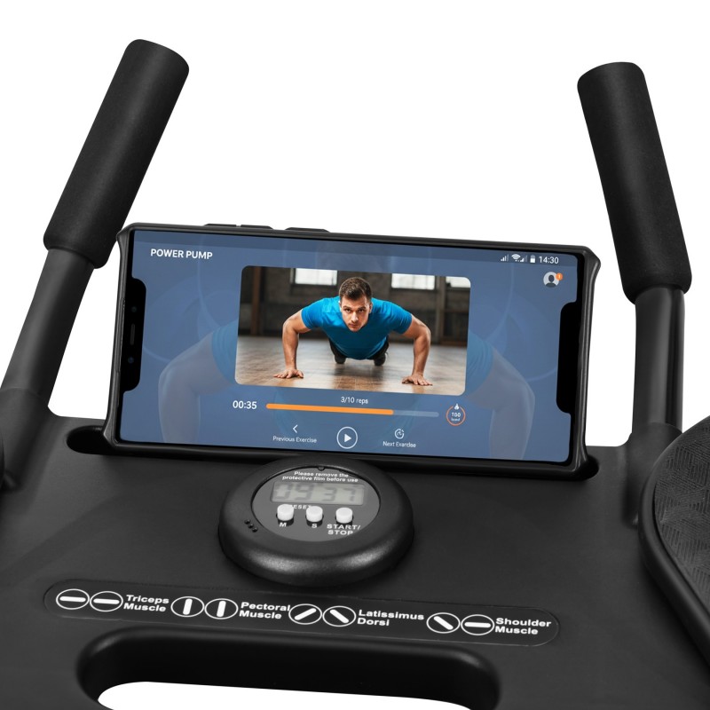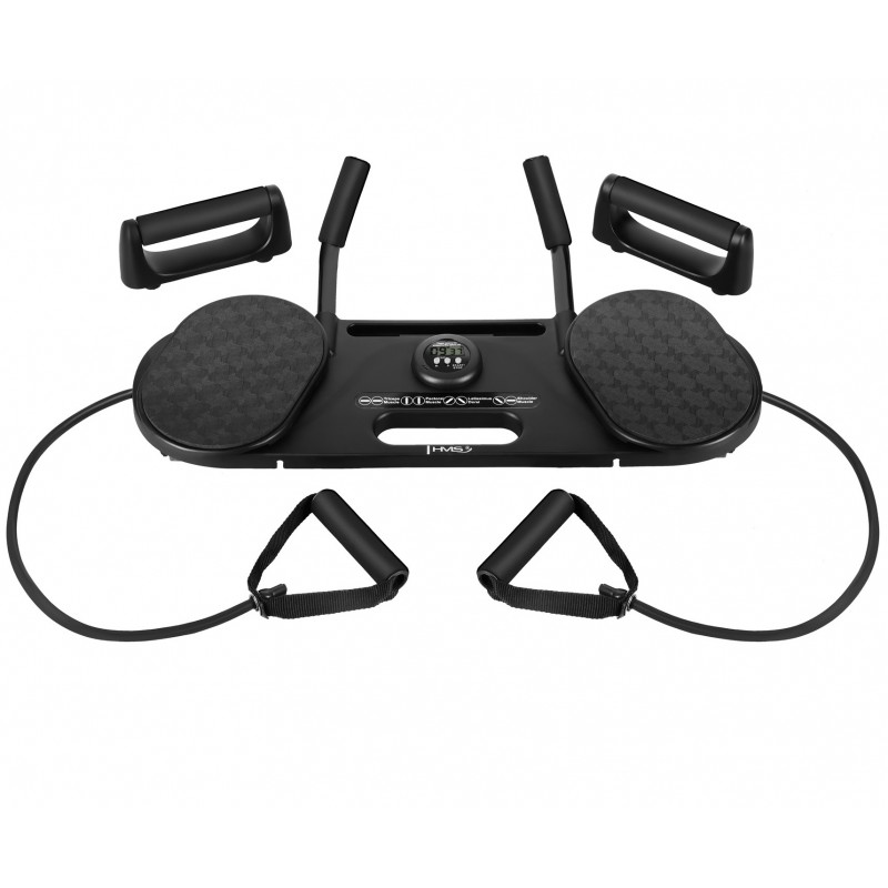 DBP02 HMS este un set compact, pliabil, pentru antrenamente complete acasă, care combină flotările cu prize multiple, exercițiile pentru core/abdomen, benzile elastice și un timer precis (minute/secunde) într-un singur echipament ușor de depozitat.