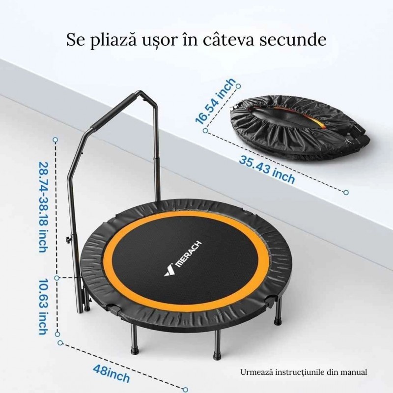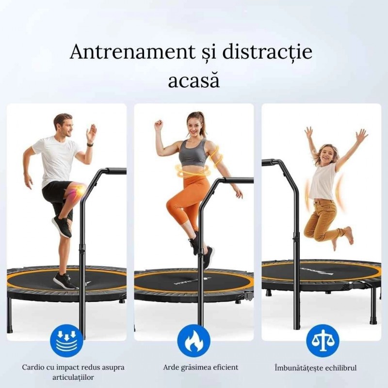 | Informatii generale | Greutate max utilizator: 150 kg Construcție / cadru: Cadru solid din oțel, cu îmbinări sudate / solide, conceput să suporte sarcinile repetate de salt Mâner reglabil Mâner ajustabil pe 4 niveluri (înălțime de la ~ 73 cm până la ~ 105 cm), adaptabil pentru utilizatori cu înălțimi între ~ 115 cm și ~ 185 cm Zgomot / funcționare silențioasă: Proiectat pentru funcționare silențioasă — afirmație comercială: “96,5 % mai silențios” decât modelele standard Sistem de pliere / stocare: Design pliat / pliabil: se poate plia pentru a ocupa mai puțin spațiu la depozitare; se menționează că poate fi pliat la ~ ¼ din dimensiunea completă. Materiale suprafață de săritură: Țesătură rezistentă (material tip nylon / PP / polimer robust) pentru platforma de săritură, concepută să reziste efortului repetitiv Picioarele de sprijin pot fi indepartate prin rotire, perfect pentru depozitare Culoare: negru cu portocaliu |