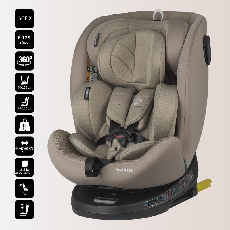 | Informatii generale | -scaun auto certificat iSize, categoria 40-150 cm -rotatie 360 grade -posibilitatea de a fi utilizat cu spatele la sensul de mers pana la 105 cm -instalare in masina cu ajutorul isofixului si a centurii top-tether; centura are eliberare rapida fara a fi necesara dezancorarea din masina -grade de inclinare bun pentru toate categoriile de inaltime si indiferent de pozitia de utilizare -insert pentru nou-nascuti cu spuma de memorie -materiale si matlasare premium pentru un grad inalt de confort |