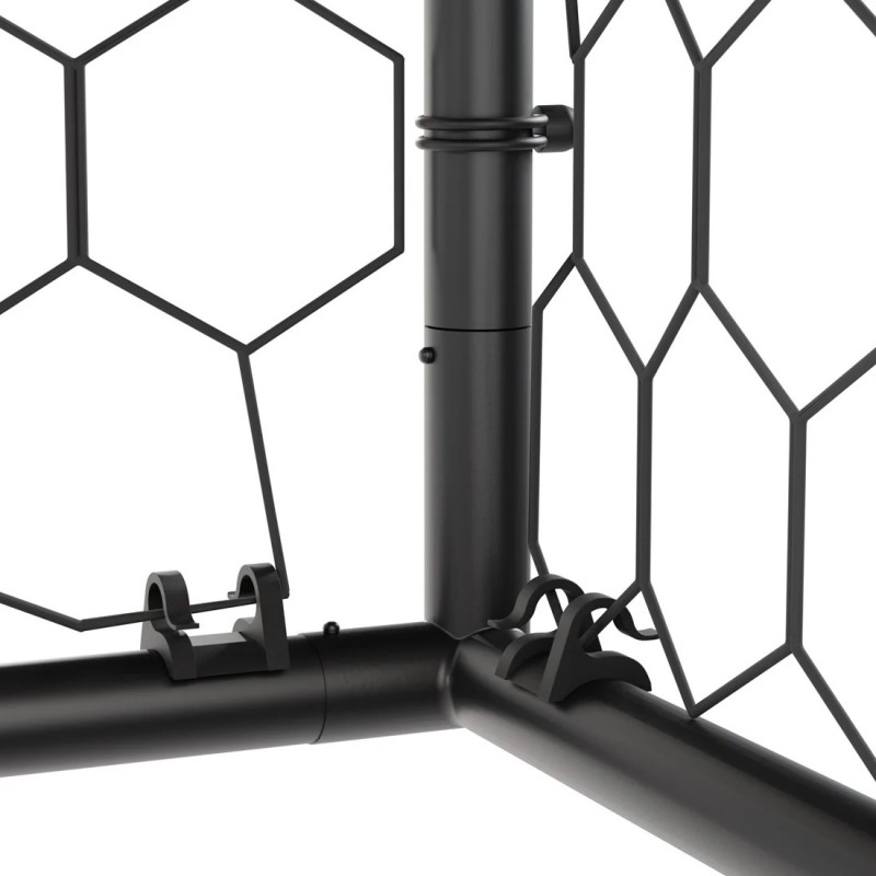 Aceasta poarta se remarca prin robustete si usurinta in utilizare. Cadrul este realizat din tevi de otel cu diametre de 60 mm si 32 mm, oferind stabilitate si durabilitate exceptionale. In plus, cadrul este acoperit cu un strat special rezistent la intemperii, ceea ce il face foarte rezistent la ploaie, vant si alte conditii meteo. Plasa din poliester de inalta calitate ofera rezistenta suplimentara si un aspect profesional.